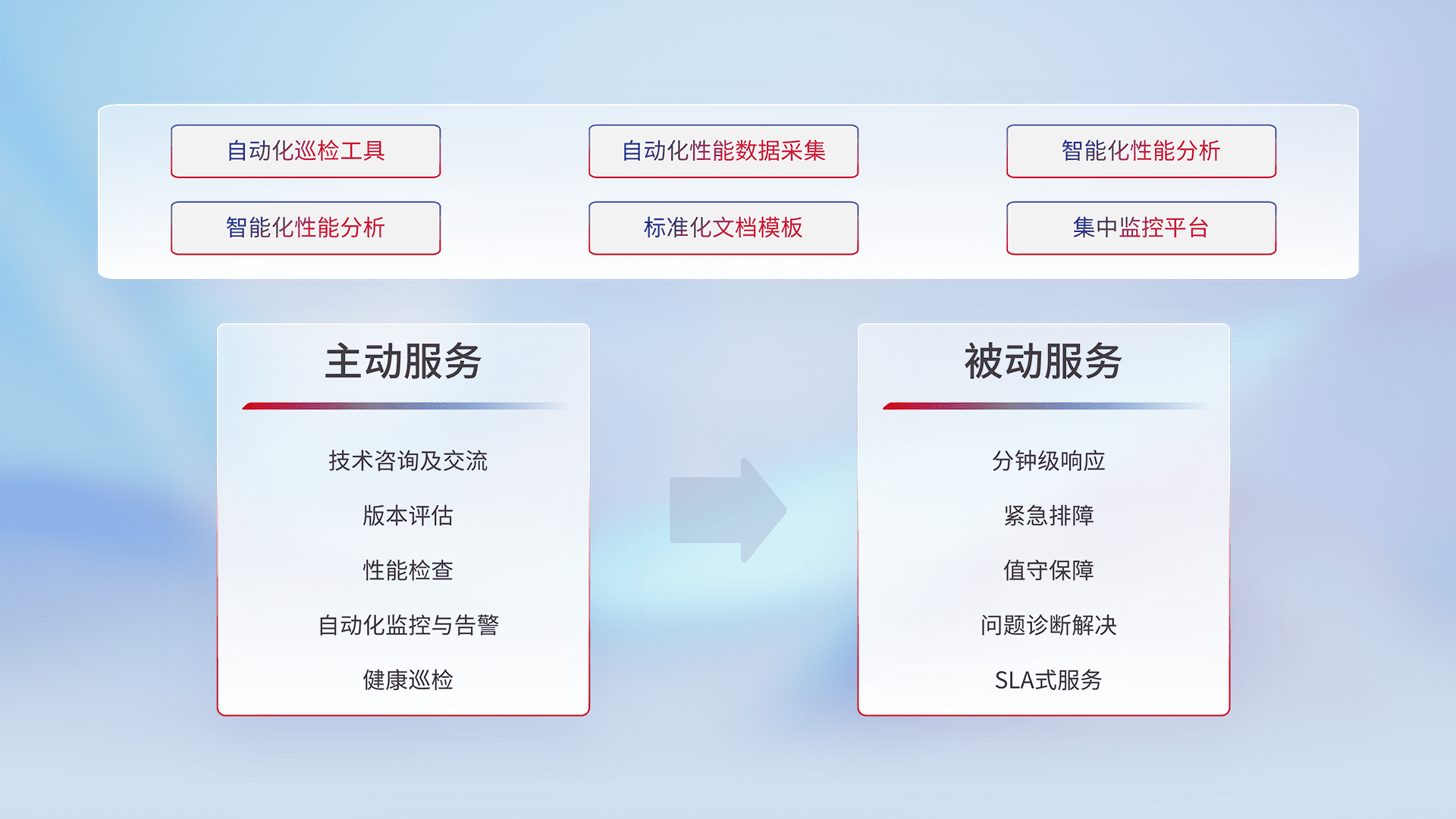智能化工具和标准化文档,,保障服务质量,,,提供主动服务(包含技术咨询、、、、版本评估、、、性能检查、、、、自动化监控与告警、、健康巡检)和被动服务包含(分钟级响应、、、、紧急排障、、值守保障、、问题诊断解决、、、、SLA服务)。。